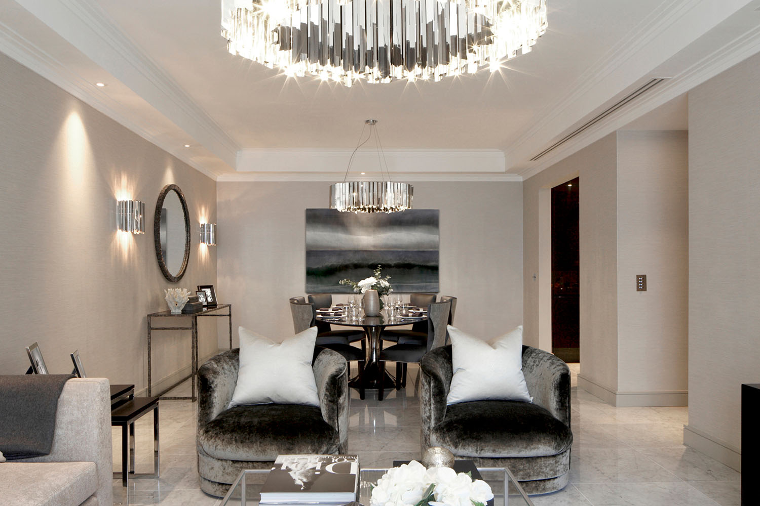 A pair of stainless steel Facet Chandeliers were specified along with Facet Wall Lights for this impressive, Central London apartment.