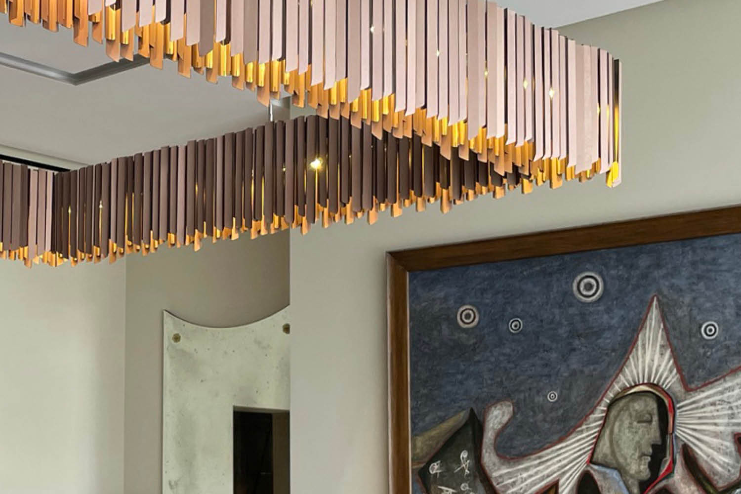 A bespoke Facet Chandelier was commissioned for this contemporary scheme in west London. Finished in a satin-bronze colour, the luminaire complements the sophisticated layers of texture and colour.