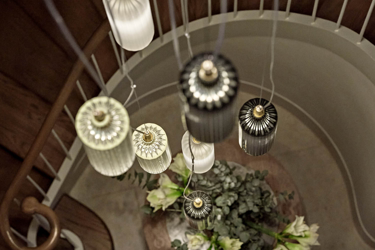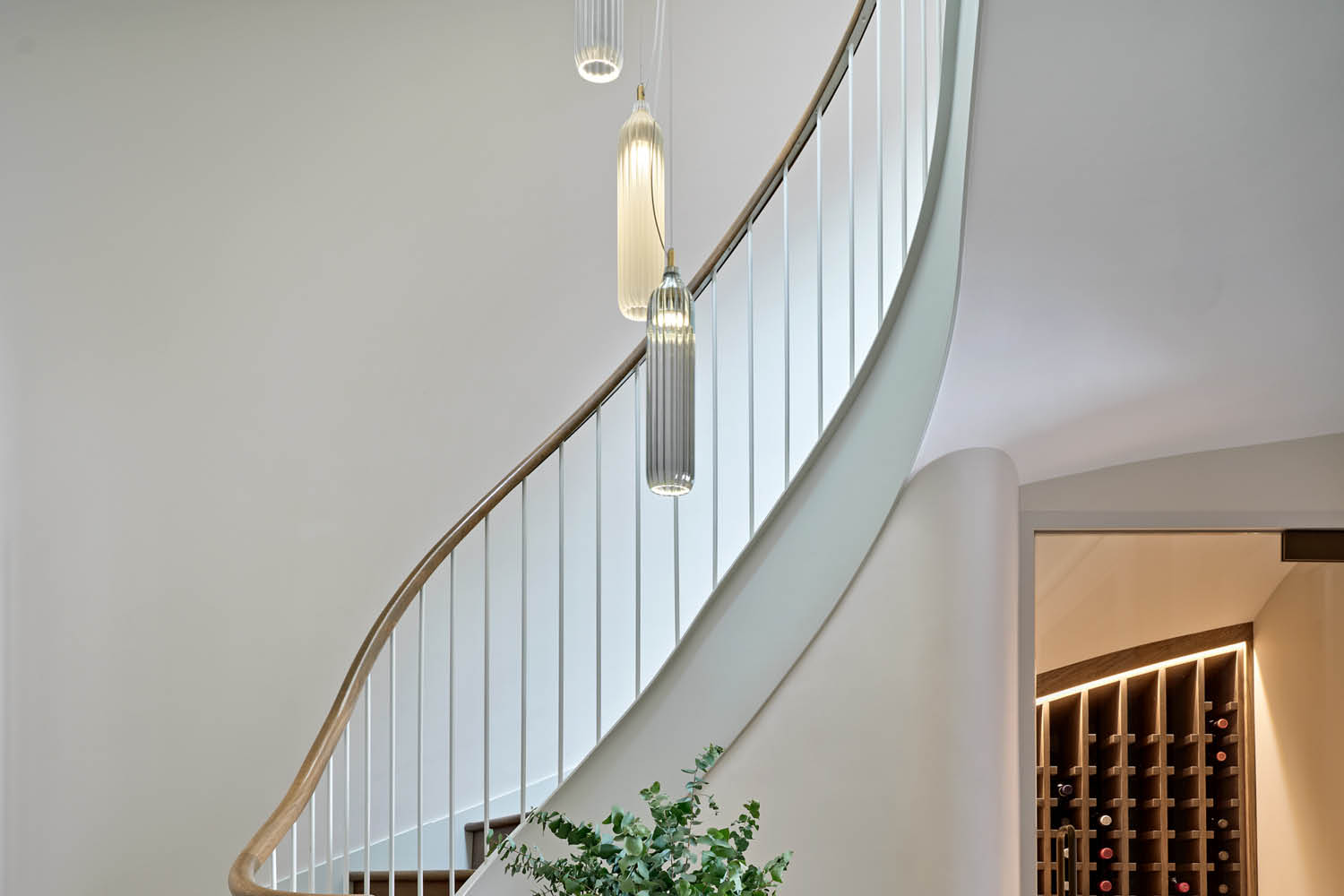 A bespoke installation of Flute Pendant lights in clear, frosted, and smoke-grey glass cascades gracefully down this striking staircase. Designed to create a breathtaking focal point and bring a warm, atmospheric glow that complements the home’s architectural detailing.
