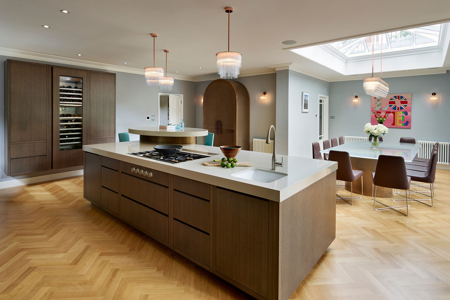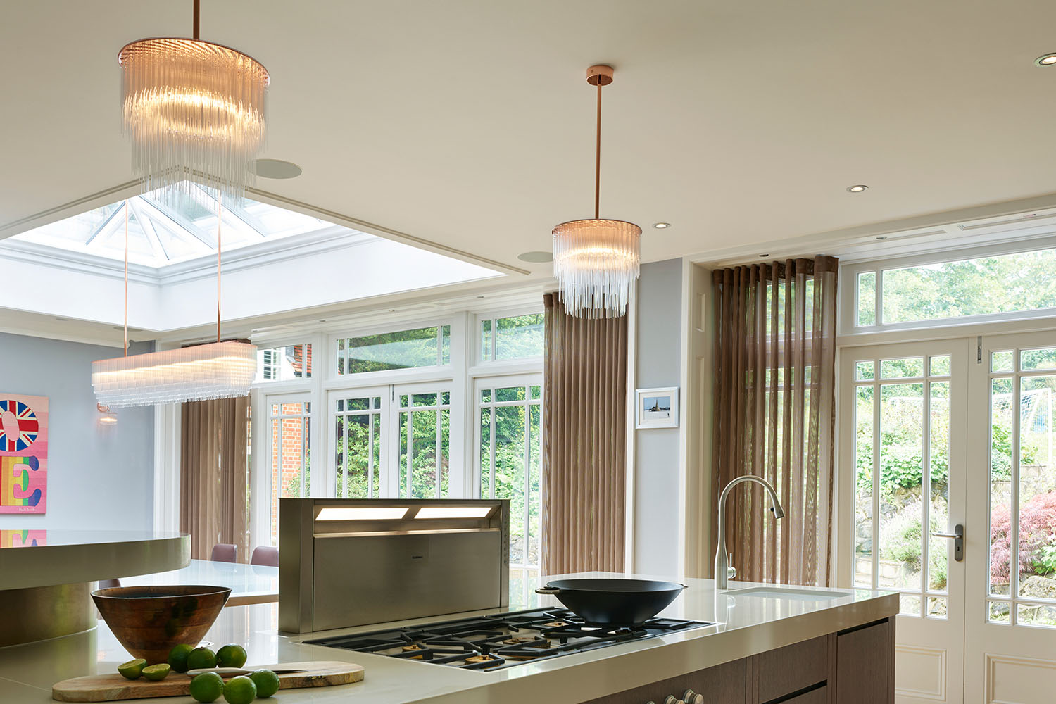 A selection of customised pendants, wall lights and a large Linear Chandelier were specified for this spacious, contemporary interior.