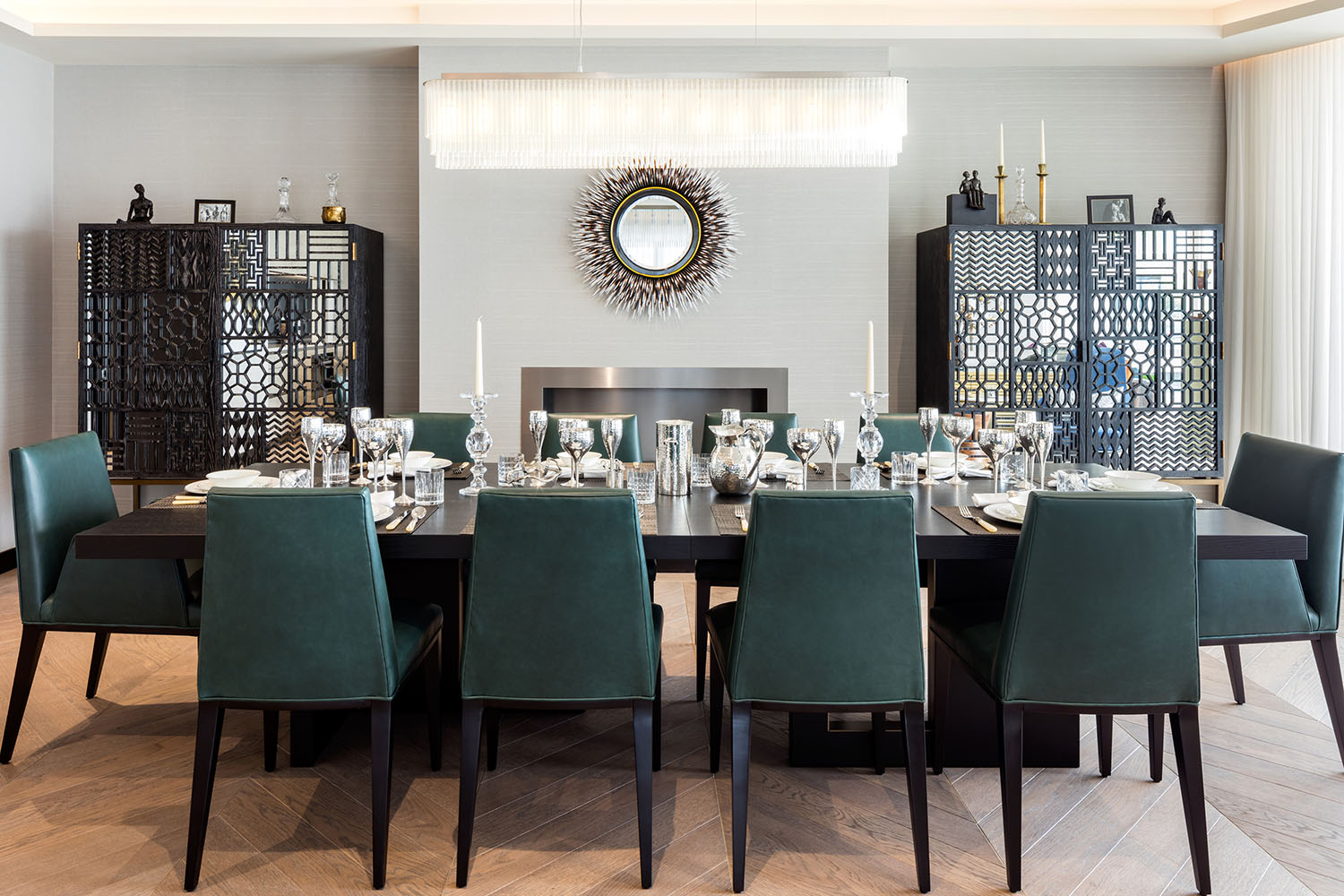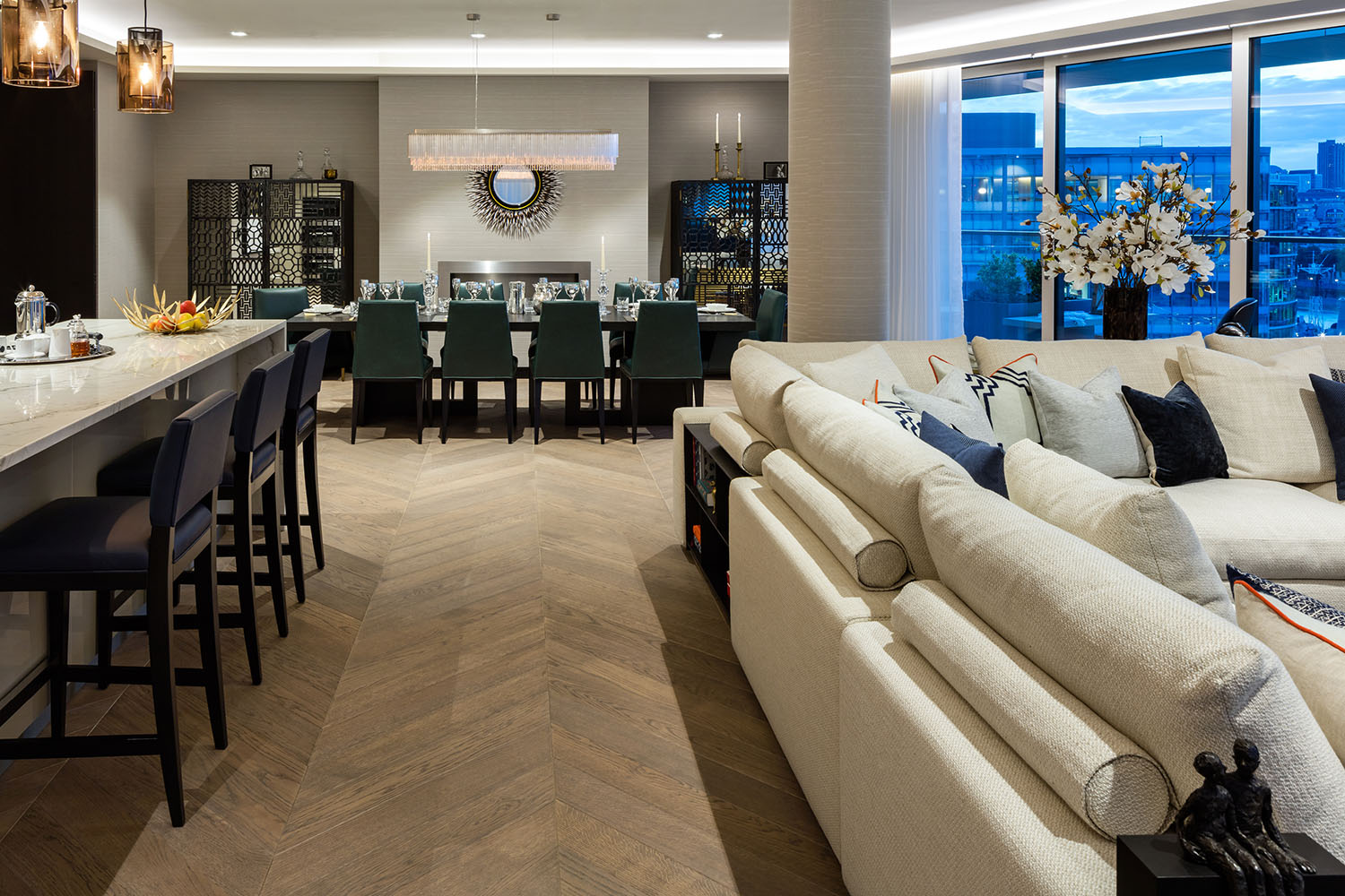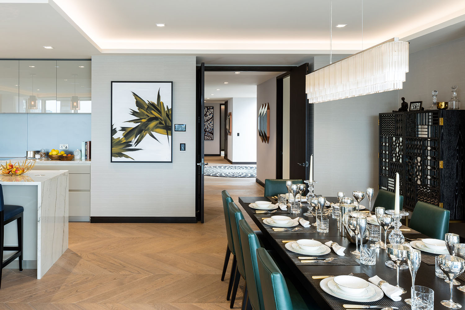Commissioned for this contemporary Riverside apartment, the Linear Chandelier Thin illuminates the dining area of the open-plan living space.