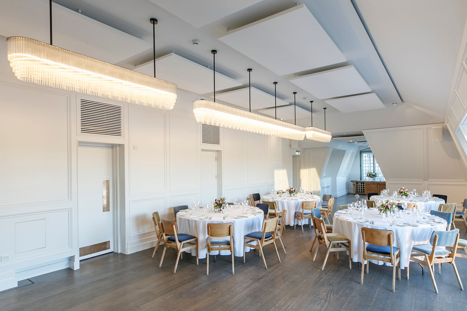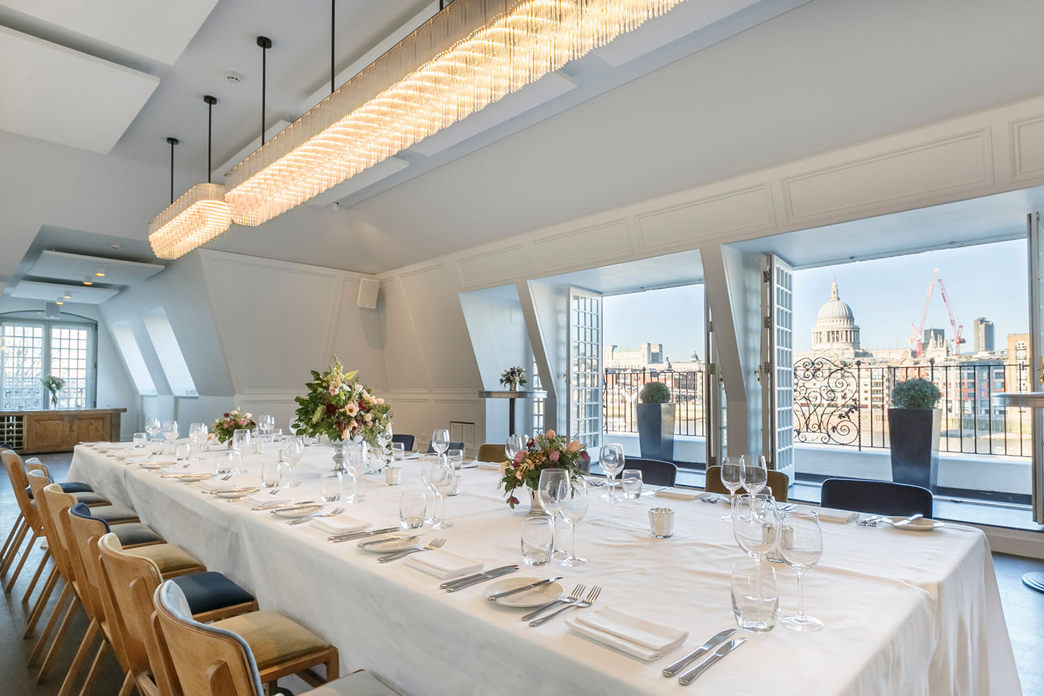 Overlooking the Globe Theatre and River Thames, a custom arrangement of Linear Chandeliers illuminates the newly refurbished Balcony Room at The Swan.