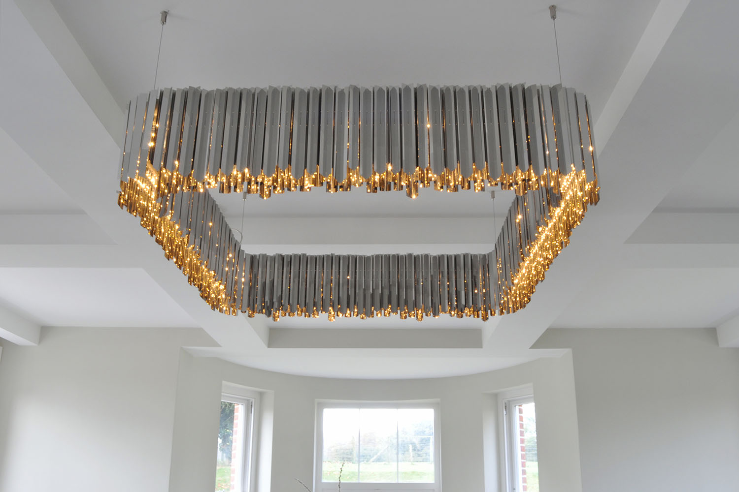 Sitting within the specially constructed ceiling recess, this rectangular Facet Chandelier is controlled by an intelligent lighting system, allowing maximum flexibility for scene setting.