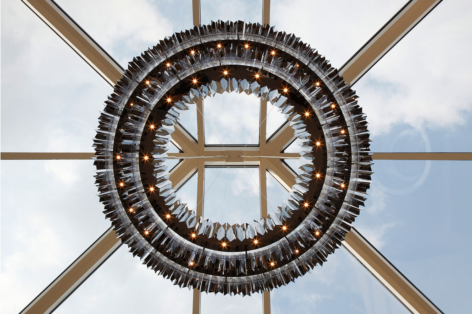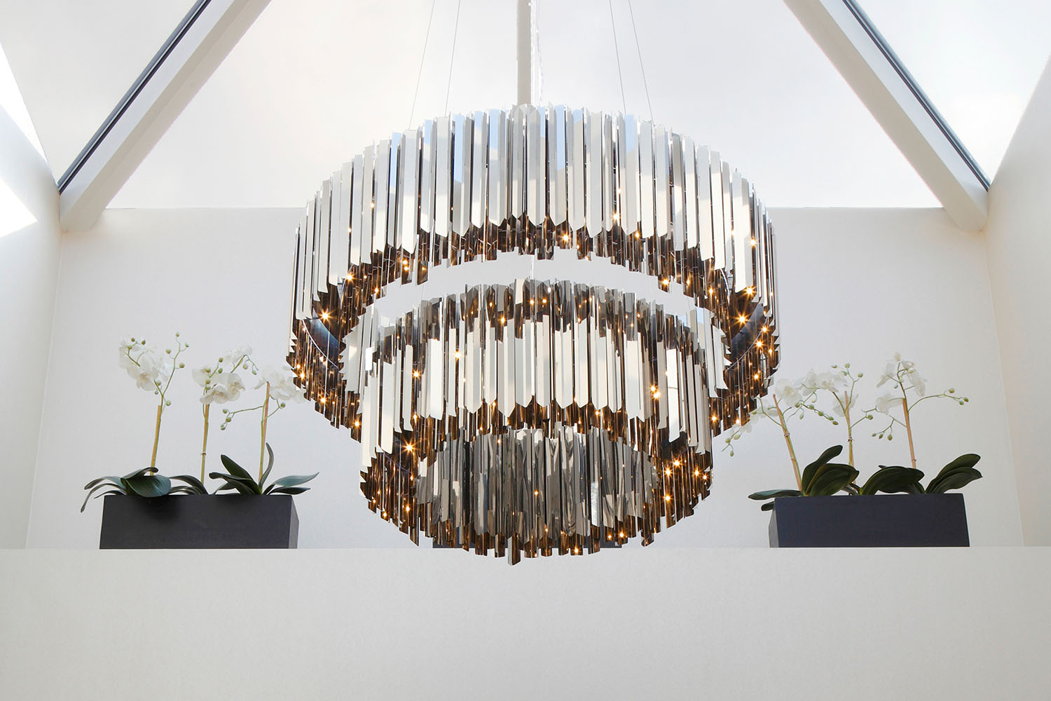 A two-tier, stainless steel Facet Chandelier was used in this double height landing area. Custom made to suspend from a glazed rooflight, the chandelier is the main source of illumination in the space.
