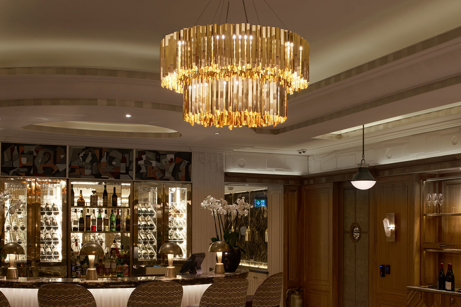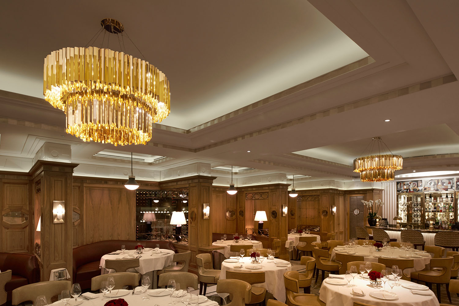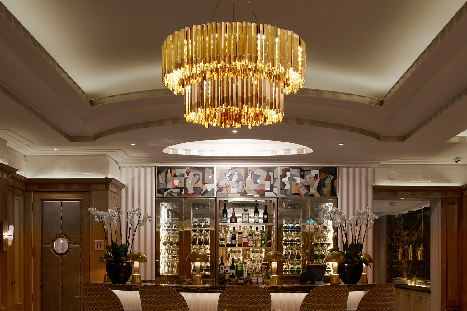 Suspended elegantly above the refurbished dining rooms, the tiered chandeliers provide a focal point and sit perfectly against the beautifully detailed Art Deco inspired interior.