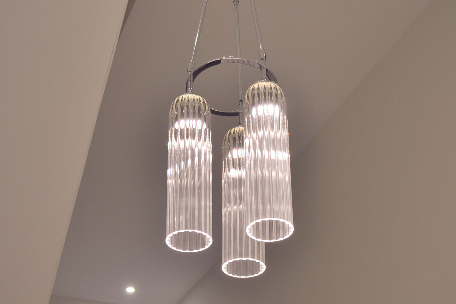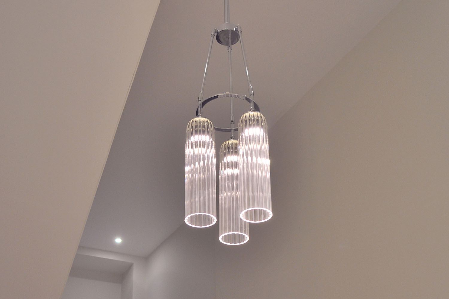 Illuminating the stairwell of a residential mansion block, the custom made Flute Pendant bridges the space between the second and first floors.