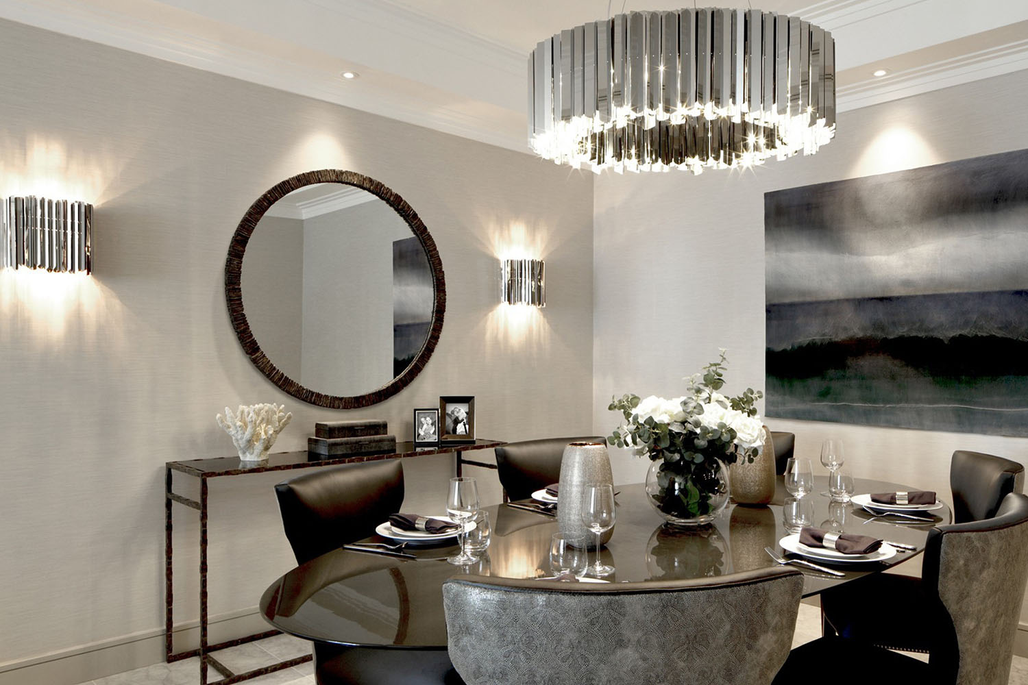 A pair of stainless steel Facet Chandeliers were specified along with Facet Wall Lights for this impressive, Central London apartment.