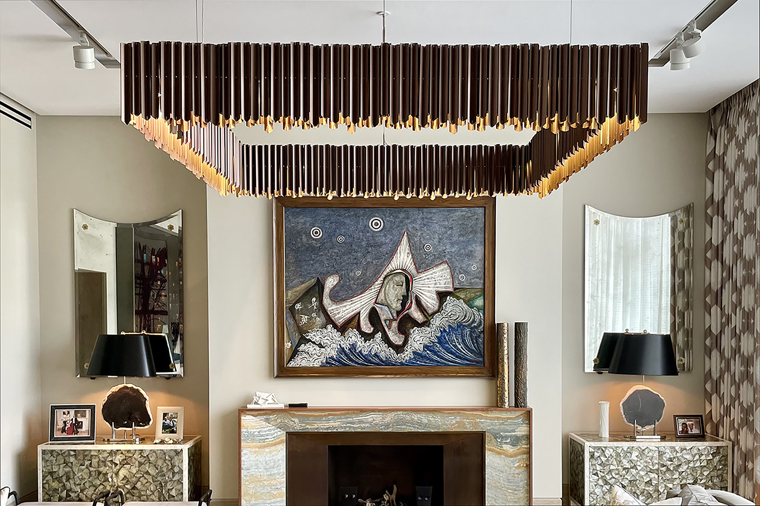A bespoke Facet Chandelier was commissioned for this contemporary scheme in west London. Finished in a satin-bronze colour, the luminaire complements the sophisticated layers of texture and colour.