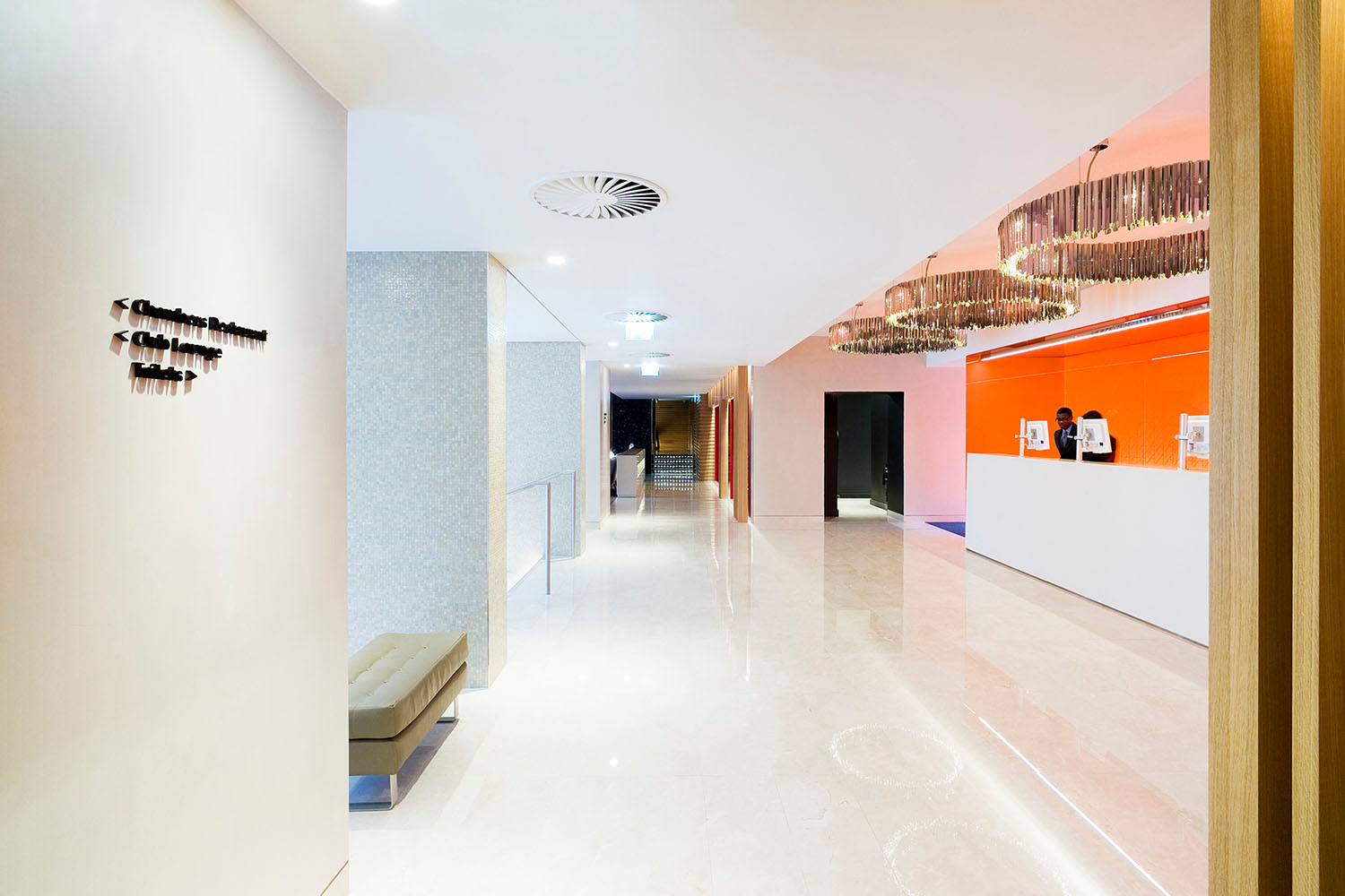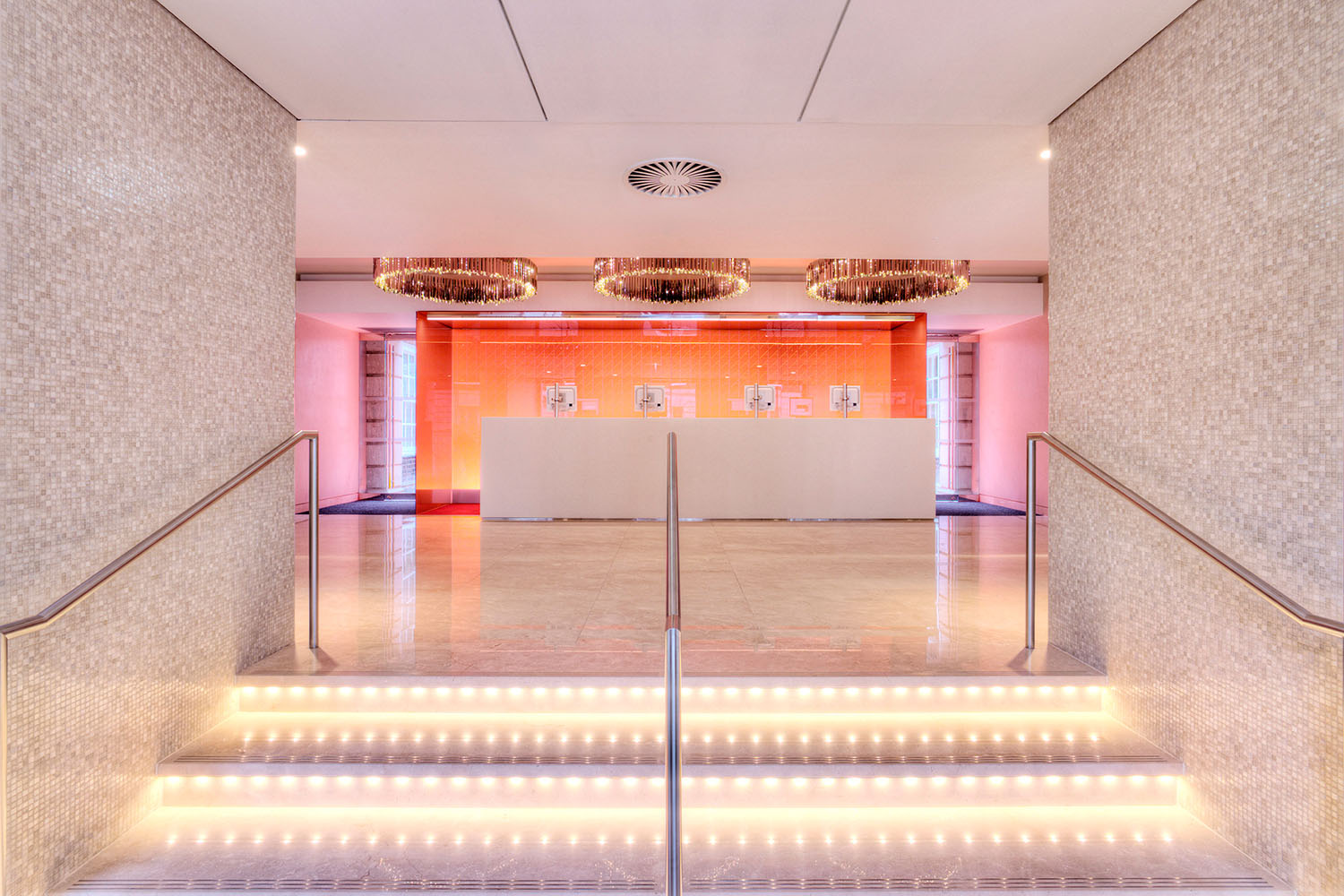 Positioned in a nine-metre long recessed area above the reception desks at the Apex Temple Court, three large Facet Chandeliers provide a dramatic centrepiece in the main entrance space.