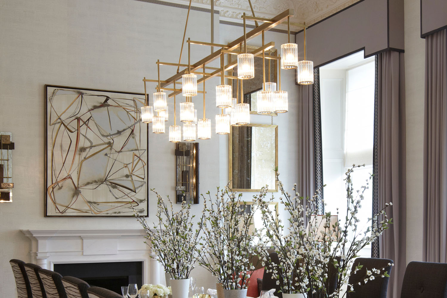 Designed for Helen Green Design, this rectangular chandelier sits majestically above a 4m dining table. The chandelier combines a brushed-brass finish with the prismatic qualities of the glass diffusers.