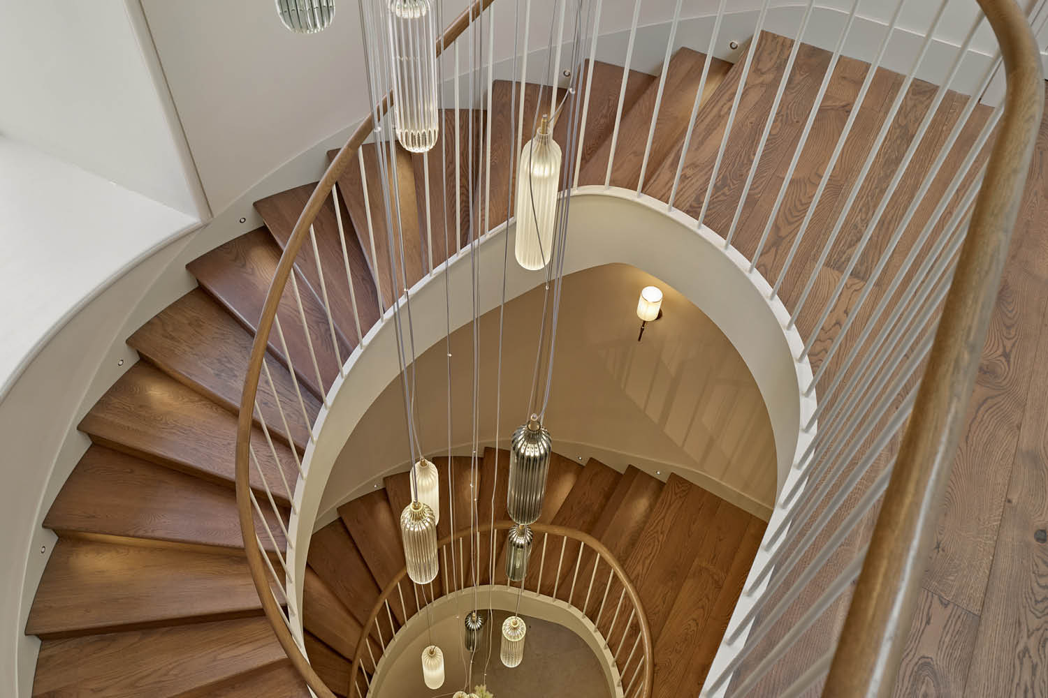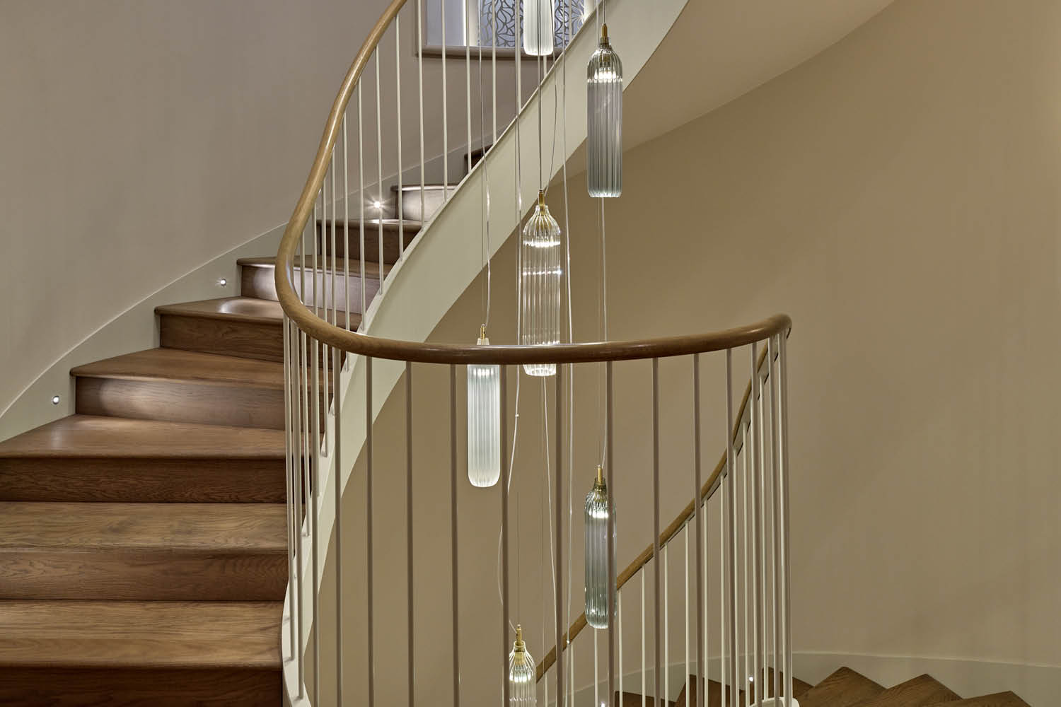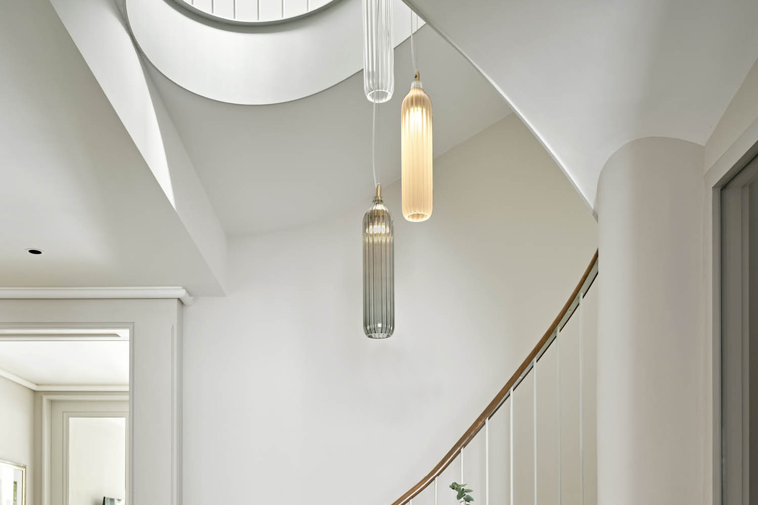 A bespoke installation of Flute Pendant lights in clear, frosted, and smoke-grey glass cascades gracefully down this striking staircase. Designed to create a breathtaking focal point and bring a warm, atmospheric glow that complements the home’s architectural detailing.