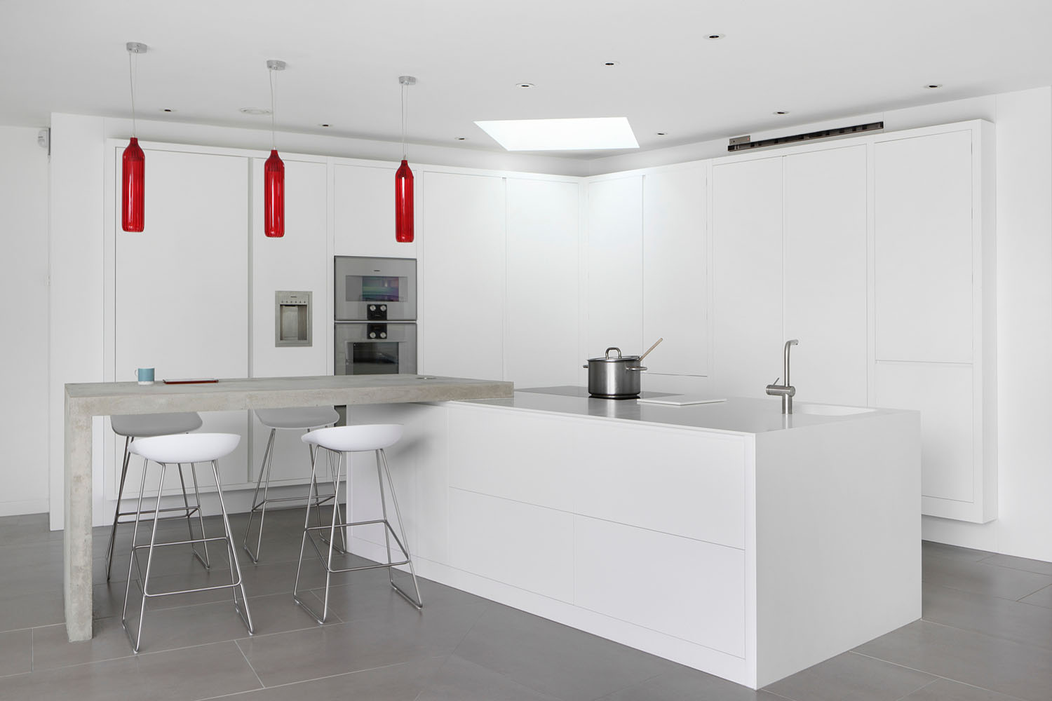 These bespoke Flute Pendants provide a burst of colour in this minimal, contemporary kitchen.