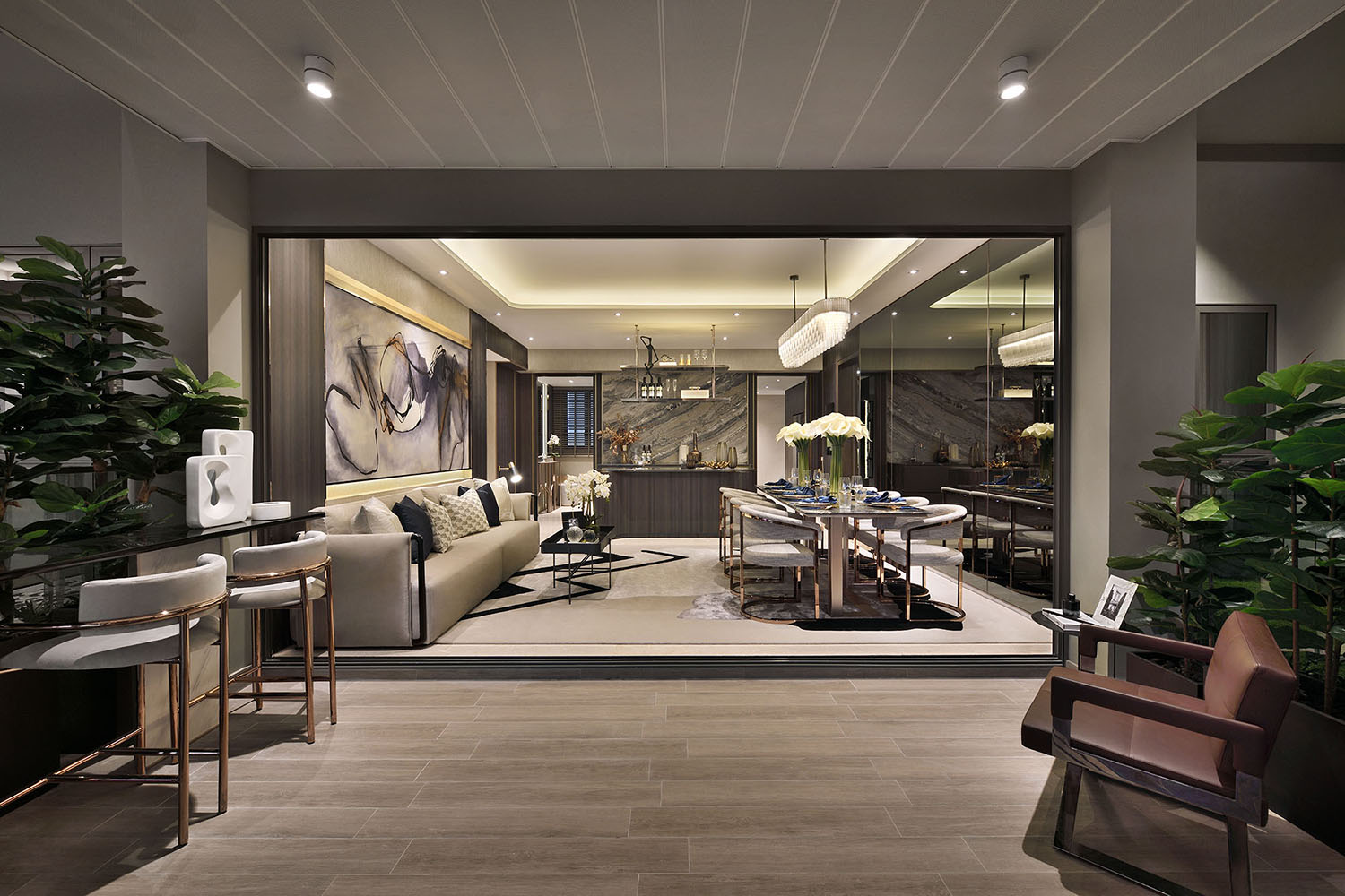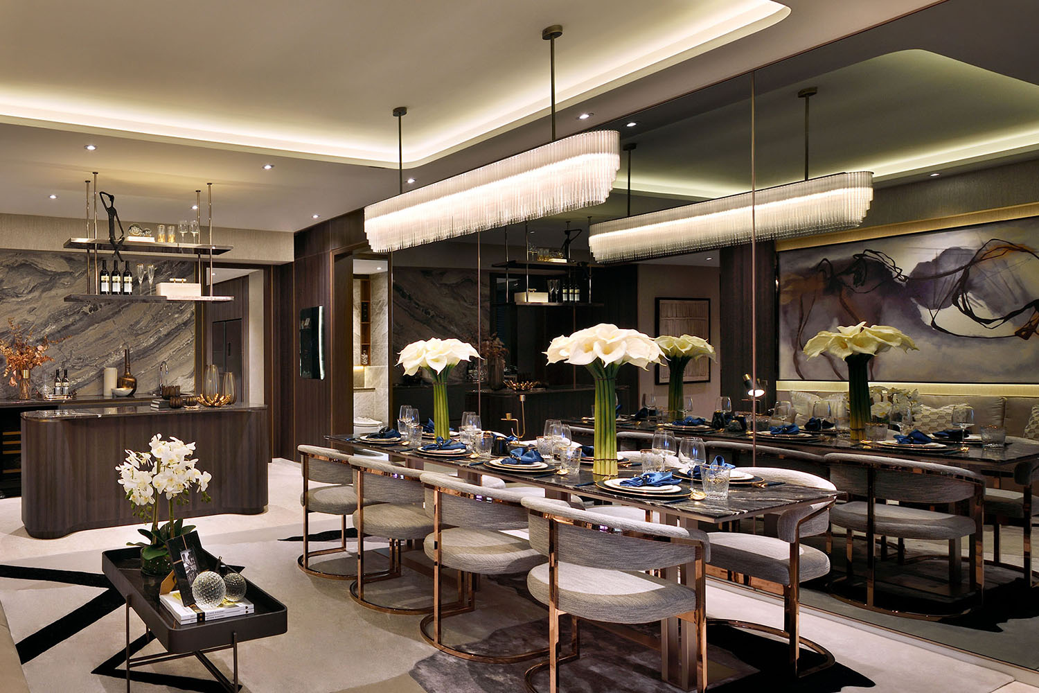 The Linear Chandelier in our brass-based Bronze finish was specified for this luxurious, residential interior in Singapore.
