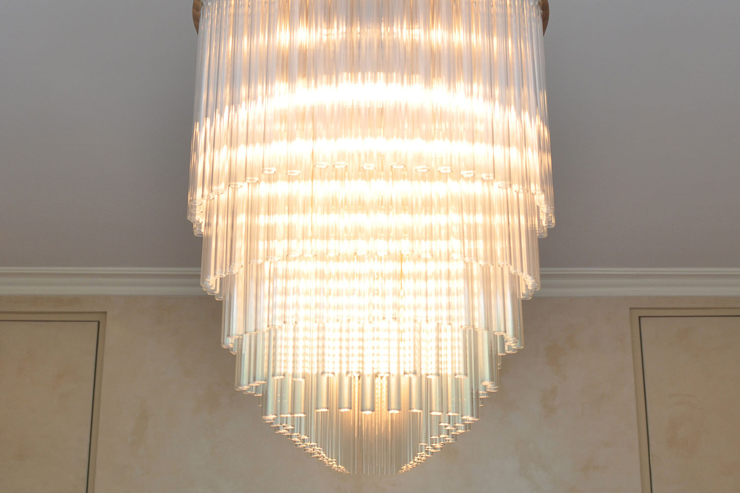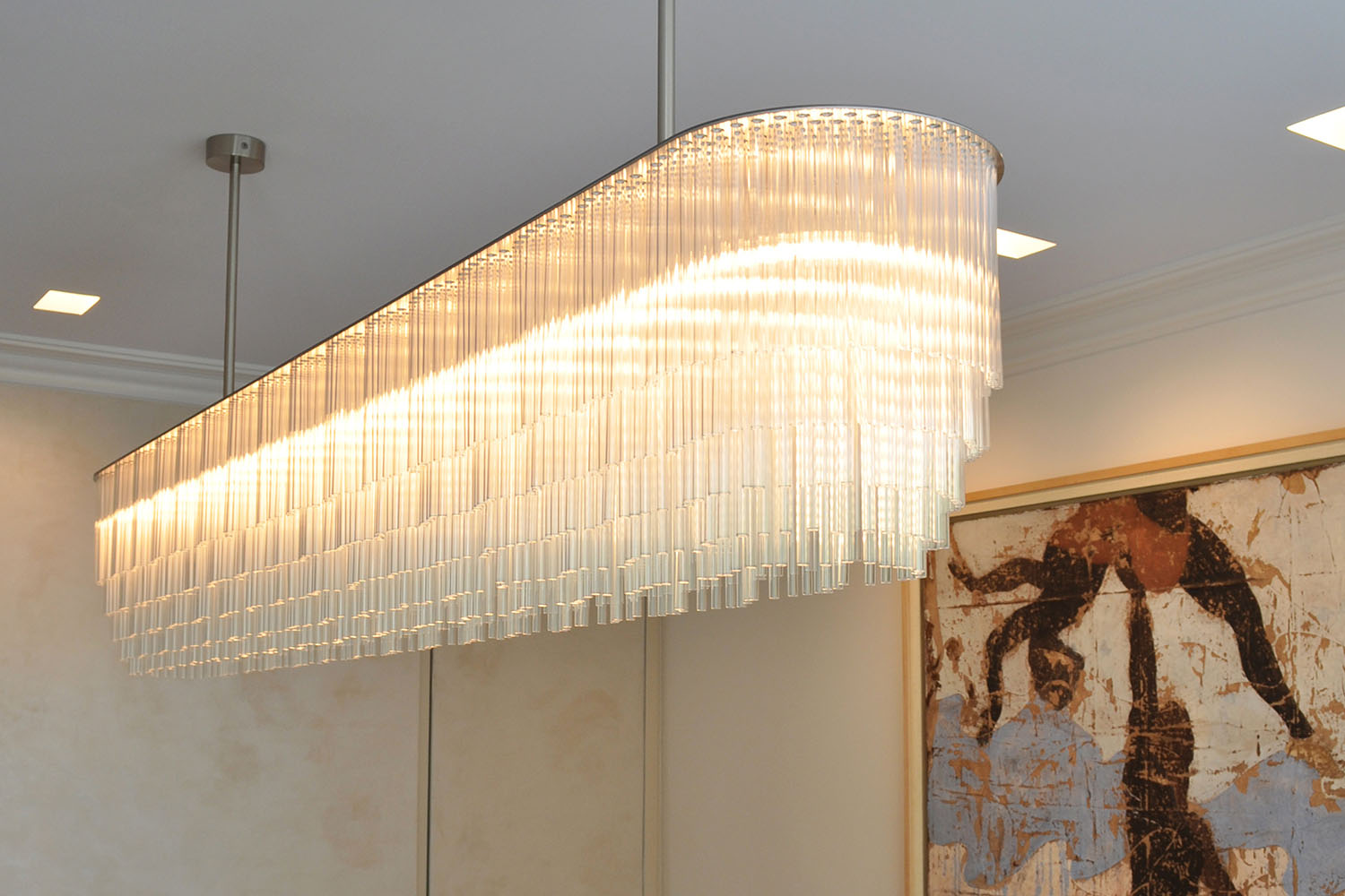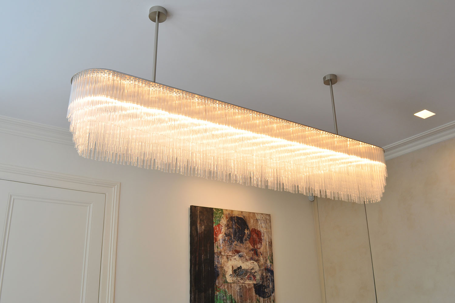 The formal dining room in this property is illuminated by a Linear Chandelier. Finished in a contemporary, brushed-nickel finish, the frame complements the stainless steel fixtures and fittings.