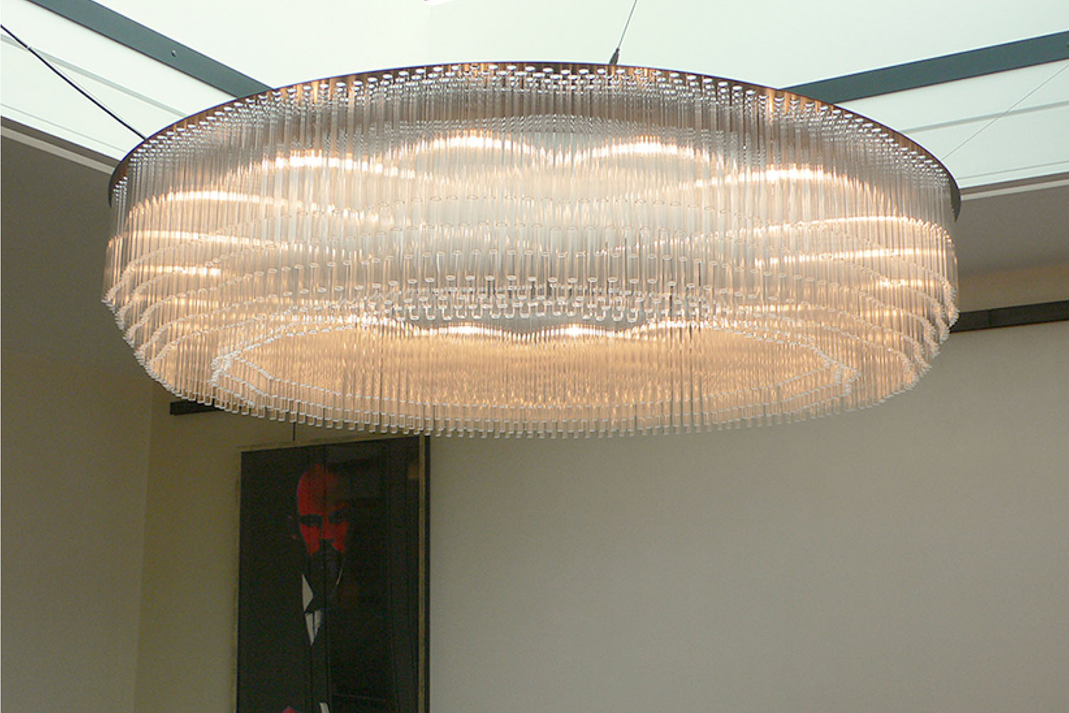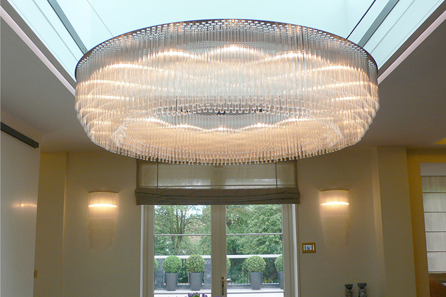 This large Ring Chandelier makes a dramatic impact as the central lighting feature in the dining area. Suspended from a custom frame, the chandelier is complemented by a pair of tiered glass wall lights.