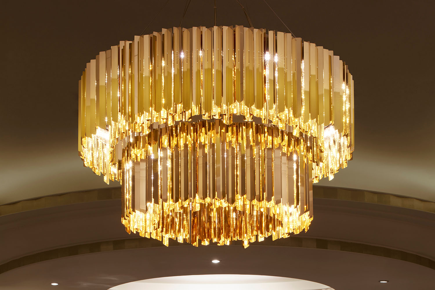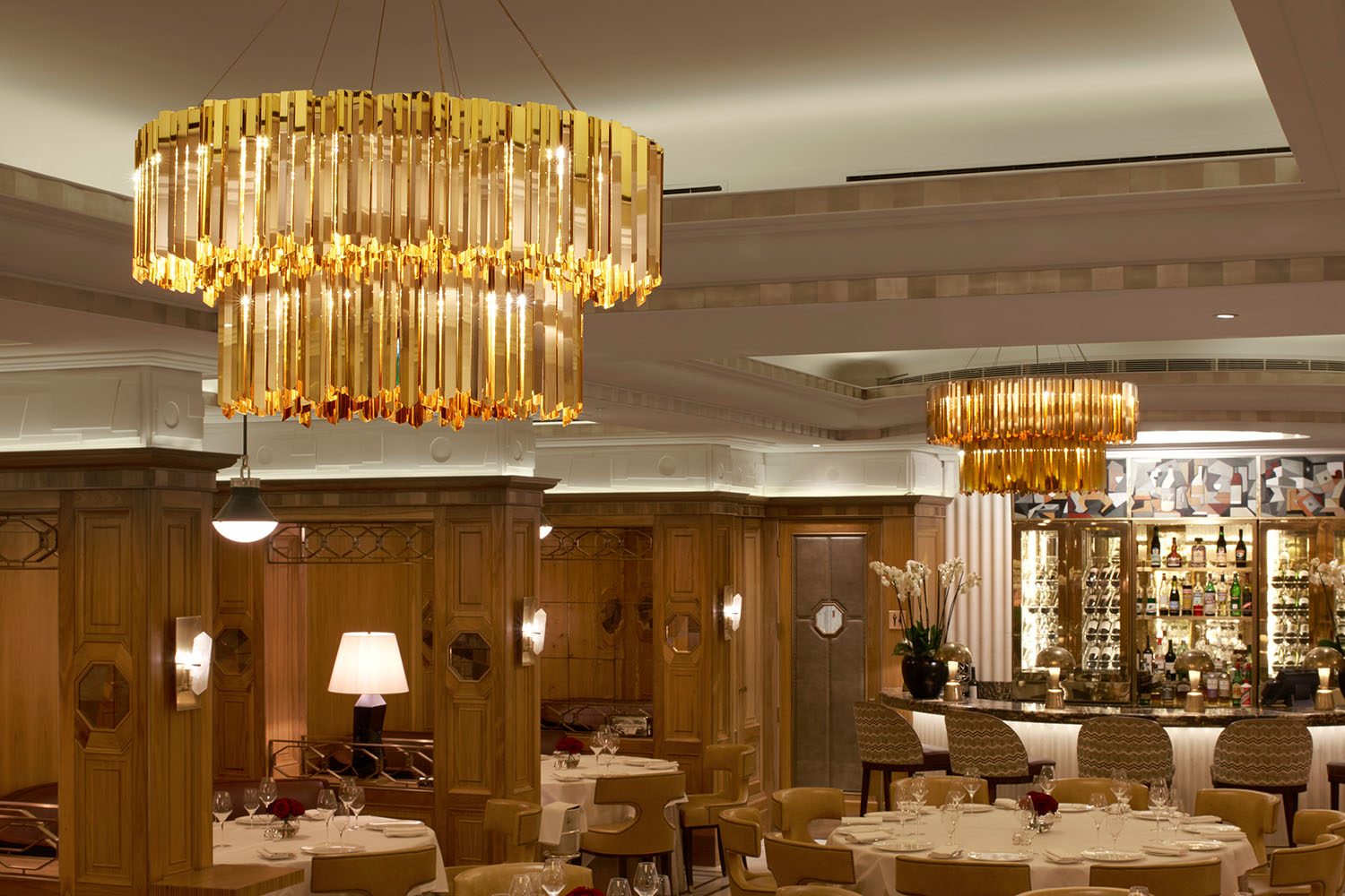 Suspended elegantly above the refurbished dining rooms, the tiered chandeliers provide a focal point and sit perfectly against the beautifully detailed Art Deco inspired interior.